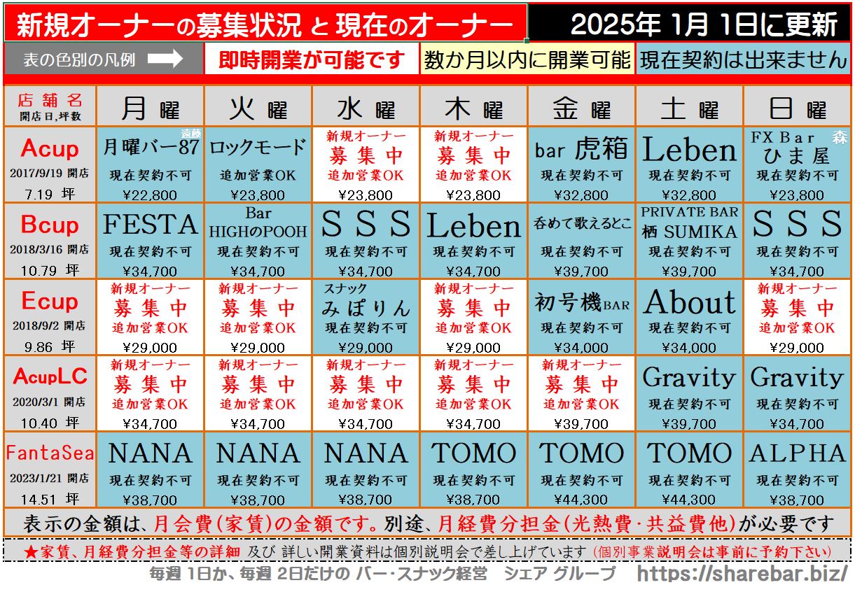 白抜き枠「オーナー募集中」と表記の店舗・曜日に於いて即時経営可能です